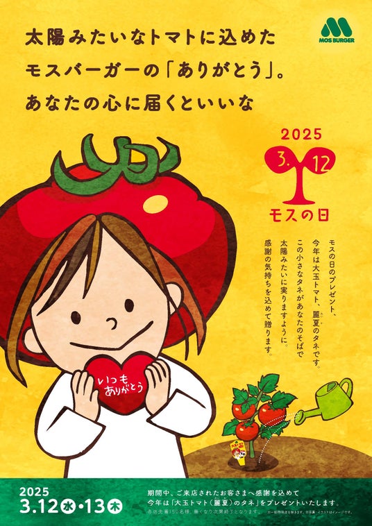 モスバーガーを展開する株式会社モスフードサービス(代表取締役社長:中村 栄輔、本社:東京都品川区)では、2025年3月12日(水)と13日(木)の2日間、全国のモスバーガー店舗(一部店舗除く)で「モスの日」を記念し、感謝の気持ちをこめて“大玉トマト麗夏(れいか)の種”をプレゼントします。期間中に店舗をご利用されたお客様を対象とし、各店先着150名様にお渡しします。