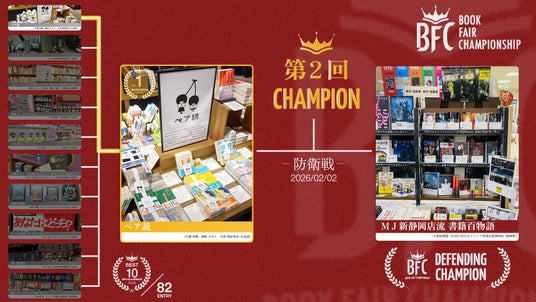 第2回BFCでベスト10の1位に選出された「ペア読」は、2月2日(月)に開催されるBFCチャンピオンベルト防衛戦・贈呈式に進出します。防衛戦では、初代BFCチャンピオン書店員のフェア企画「MJ新静岡店流 書籍百物語」が王座を防衛するのか、それとも新たなチャンピオンが誕生するのか、第2代BFCチャンピオンを決定します。