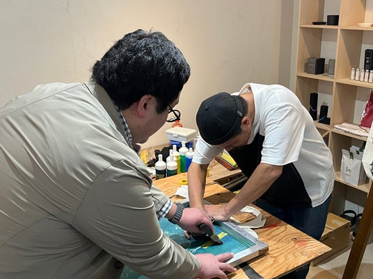 原宿店では岐阜会場(※1月31日終了)でもオリジナルTシャツプリント体験が好評だった、岐阜県郡上市にある創業50年のシルクスクリーン印刷会社「上村考版」さんが東京会場の原宿店に期間限定(1月31日~2月2日)で特別出店。現在、店舗でのプリント体験は終了してしまいましたが、上村考版さんが制作したオリジナルTシャツは購入可能です。