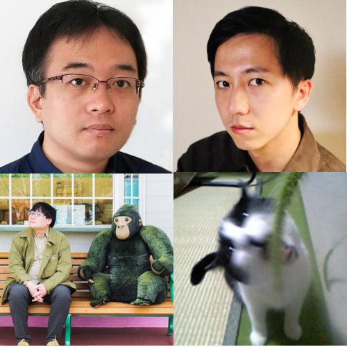 (写真左上から時計回りで)メンター:田辺剛(下鴨車窓) 参加劇作家:岡本拓也(劇団サカナデ)、長谷川彩(劇団さよなら)*猫の写真、斜田章大(廃墟文藝部)