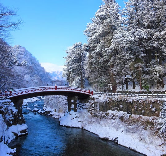 世界遺産の入口にかかる朱色の橋「神橋」に雪がかぶるとより一層朱色が美しく映え、聖域への入口がより神聖なものとなります。