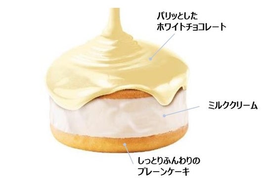 - しっとりふんわり食感のプレーンケーキでミルククリームをサンドし、最後にパリッとしたホワイトチョコレートでコーティングしました。