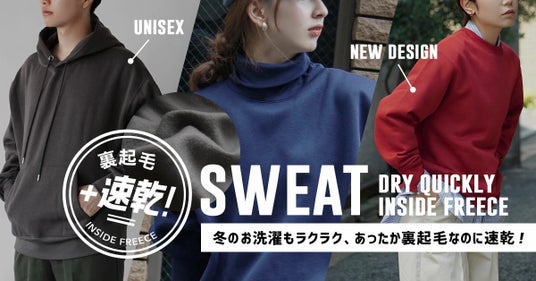 冬でも・厚手なのに・すぐ乾く!?あったか裏起毛なのに驚きの速乾性。冬の洗濯のお悩みを解決する「速乾裏起毛 ボリュームスウェットシリーズ」。ユニセックスデザインで男性へのプレゼントにも