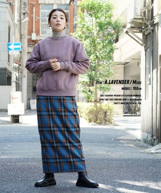 レイヤードコーデもしやすいデザイン([クルーネックプルオーバー]アッシュラベンダー着用)