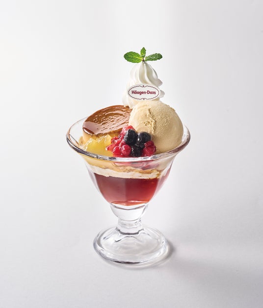 ハーゲンダッツの濃厚なキャラメルアイスクリームとアールグレイゼリーが相性抜群のパフェ。アールグレイゼリーは今回のパフェのために開発した、紅茶の風味が際立つ甘さ控えめのゼリーです。高さ約30cm中に、様々な食感や味わいを詰め込んだ、至福のご褒美パフェです。