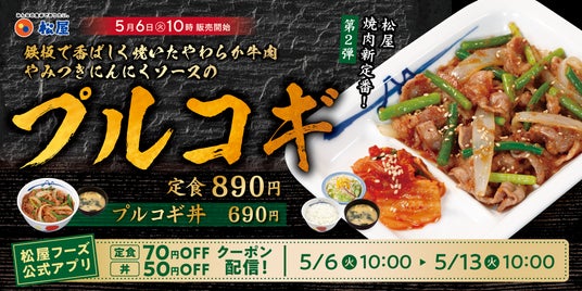 ■香ばしい牛焼肉とシャキシャキ食感の野菜に、にんにくソースを絡めたやみつき必至の逸品。 自社製富士山ミニキムチ付きの定食または丼の2種のスタイルをお好みで。 今回登場する「プルコギ」は、鉄板で香ばしく焼いたやわらか牛肉・シャキシャキとした食感で鮮やかな緑色のにんにくの芽・甘みのある玉ねぎを、やみつきにんにくソースで絡めた逸品です。食欲をそそるにんにくの香りと、具材の食感が楽しめるこちらの商品は、4月より発売の「牛焼肉ピリ辛炒め」に続く、松屋の焼肉新定番第2弾。お好みに合わせてお選びいただける、定食と丼の2種類をご用意しました。定食には、ピリっと辛いのが癖になるシャキシャキ食感の自社製富士山ミニキムチがついてきます。満足いただけること間違いなしの自信作を、この機会にぜひご賞味ください。 ■モバイルクーポンがお得! 2025年5月6日(火)10時~5月13日(火)10時まで、モバイルクーポンにてご注文いただくと、「プルコギ丼」が50円引き、「プルコギ定食」が70円引きでお買い求めいただけます。