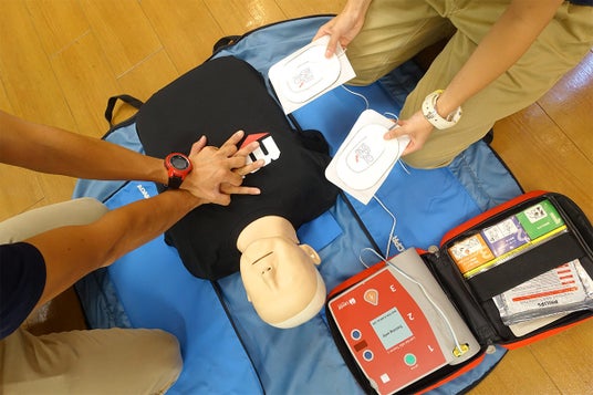 パパラギの「エマージェンシー・ファースト・レスポンス(EFR)」コースでは、「国際蘇生法連絡委員会の基準に基づいた最新の救急法」と「患者の心臓に電気ショックを与える装置であるAED(自動体外式除細動器)の使い方」を行います。