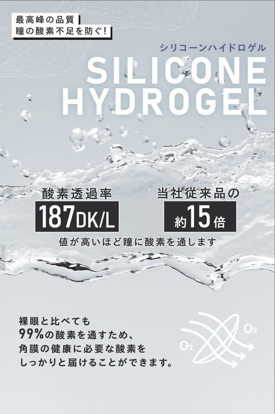 瞳に酸素を直接届けられる『シリコーンハイドロゲル素材』のレンズで、瞳の酸素不足を防ぐとともに、充血リスクを軽減し、1日中快適な着け心地に。酸素透過率(DK/L値)は187DK/Lと当社従来品の約15倍を実現しました。
