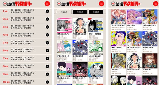 2014年9月~2024年8月末までに「少年ジャンプ+」初出で配信された読切を、1年ごとに「閲覧数順」「いいジャン率順」で20作品ずつ紹介します。