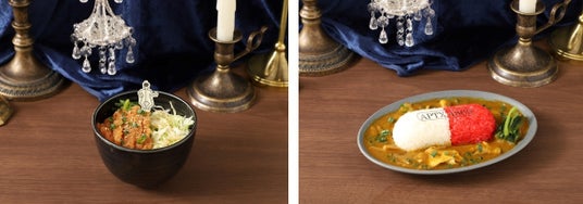 各キャラクターをイメージした創作そばと、出汁が効いたミニカレーのセット。