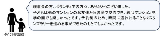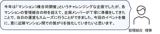 イベントでは、各マンションの敷地・共用部分に企画ブースを設置し、各住民がマンション内を行き来することで、住民同士が交流する機会を作り出しました。また各マンション管理組合のさまざまな知見がイベントの随所に活かされることで、イベント開催に関する集合知の形成も図ることができました。