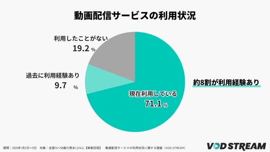 2025年1月2日~9日の期間で15歳から59歳の男女1,014人を対象に動画配信サービスの利用状況を調査したところ、「現在利用している」が71.1%、「過去に利用経験あり」が(9.7%)、「利用したことがない」が19.2%という結果でした。