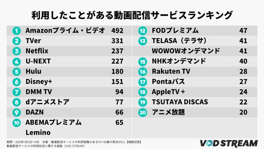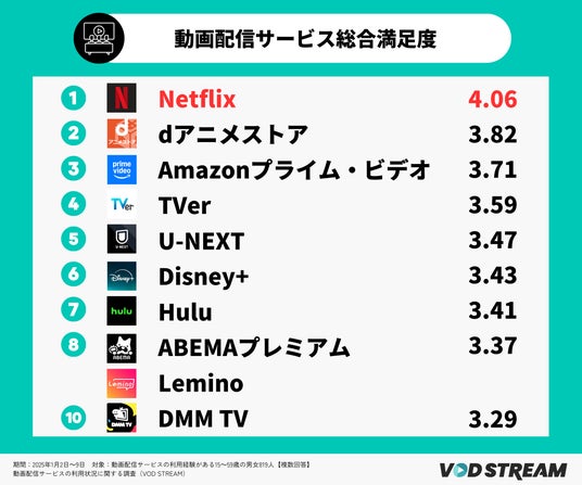 動画配信サービスの利用経験は過去最高の8割超、総合満足度は「Netflix」が2年連続首位(VOD STREAM調べ)
