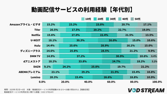 年代間で利用率の開きが少なく、どの世代でも比較的まんべんなく利用されていたのが「TVer」と「Amazonプライム・ビデオ」でした。