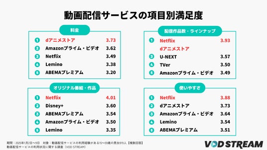 - 評価項目別満足度は「Netflix」が3部門で首位に