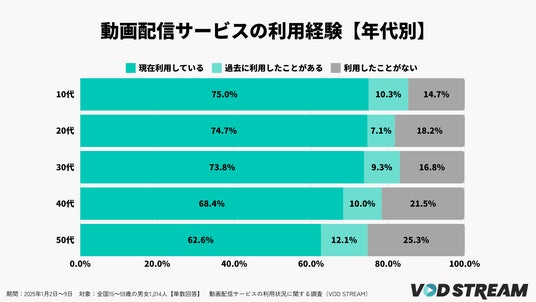 さらに年代別に見ると、現在利用中の割合は10代が75.0%と最も高い一方で、年代が上がるほど少なくなる傾向があり、50代では62.6%でした。年代によるばらつきはありますが、全年代で半数以上の人が利用していることを踏まえると、VODサービスは幅広い世代に広がっているといえるのではないでしょうか。