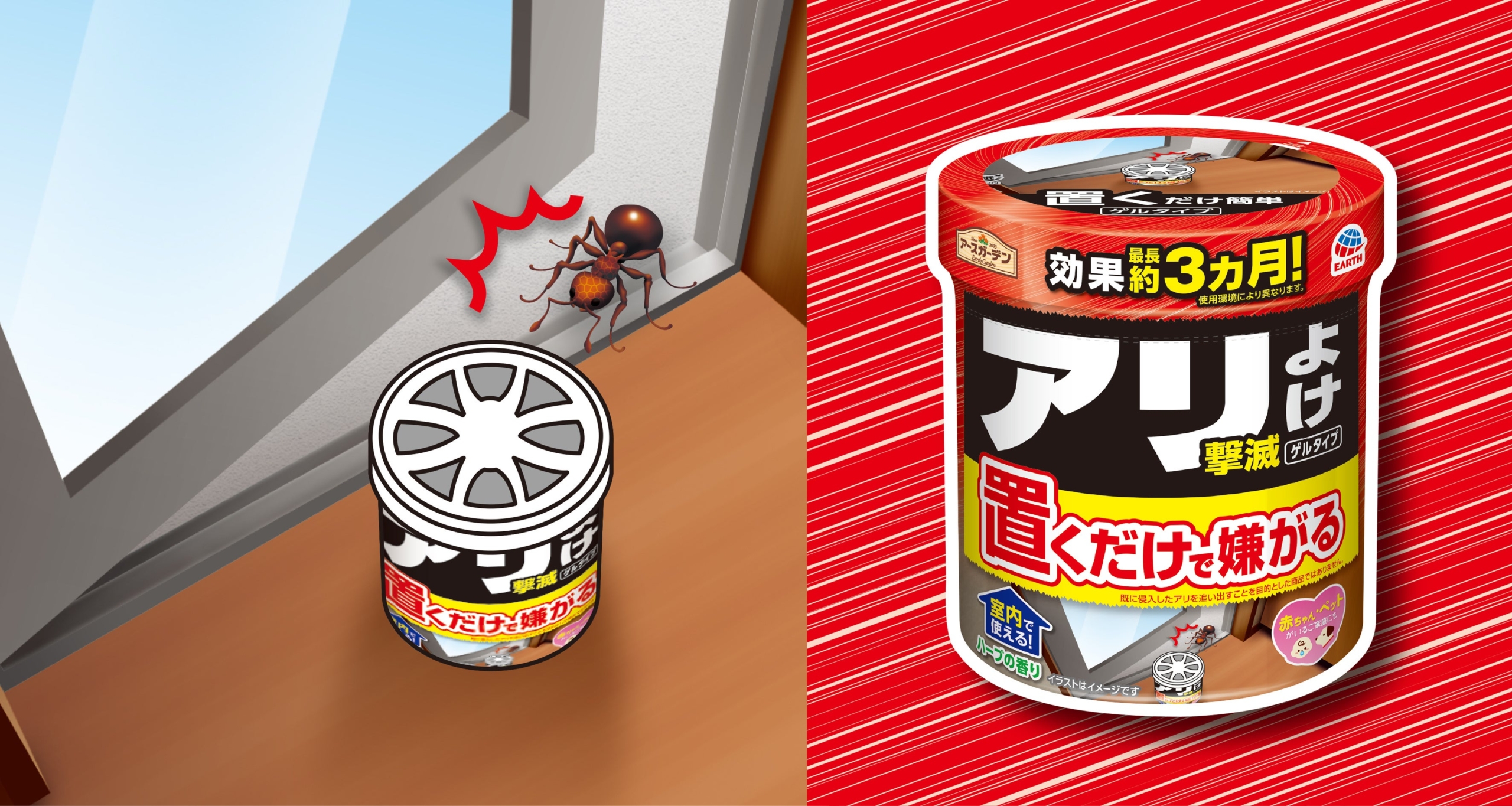 『アースガーデン アリよけ撃滅 ゲルタイプ』は、ご家庭の玄関、勝手口、窓際に置くだけでアリが嫌がり、侵入させないゲルタイプの忌避剤です。毎年アリが家に入ってきて困っている方や、赤ちゃんやペットがいるご家庭でアリ対策をしたいというお客様にぴったりな使いやすい新製品です。