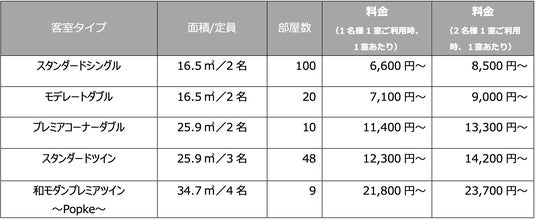 客室タイプは、スタンダードシングル、モデレートダブル、プレミアコーナーダブル、スタンダードツイン、和モダンプレミアツイン~Popke~の5タイプです。スタンダードツインは3名様まで、和モダンプレミアツイン~Popke~は4名様までご利用可能で、ビジネスからレジャーまで、幅広い用途でご利用いただける客室をご用意いたしました。