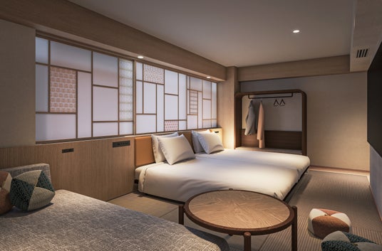 靴を脱いでお過ごしいただけるスタイルの客室です。北海道の伝統的な文化からインスピレーションを受けた文様を散りばめた障子と畳が、温もりある和室の雰囲気を残しながら、モダンでリラックスできる空間を演出いたします。