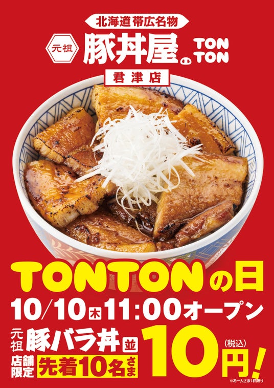 ワンズトライン株式会社(本社:大阪市北区芝田2丁目3番16号、代表取締役:山内仁)は、千葉・君津市に「元祖豚丼屋TONTON 君津店」(住所:千葉県君津市北久保1-3-12、TEL:0439-29-5722)を、'24年10月10日(木)オープンいたします。