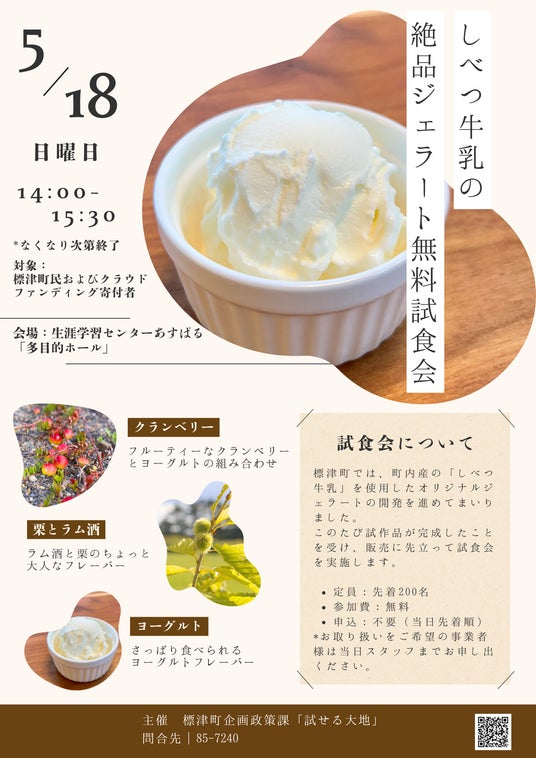 なお、現時点では牛乳以外の素材を町外から調達しておりますが、将来的には地元産素材の活用を視野に入れております。 商品のお披露目として「無料試食会」を開催! 完成したジェラートを広く地域の皆さまに味わっていただくため、以下のとおり無料の試食会を開催いたします。 試食会概要