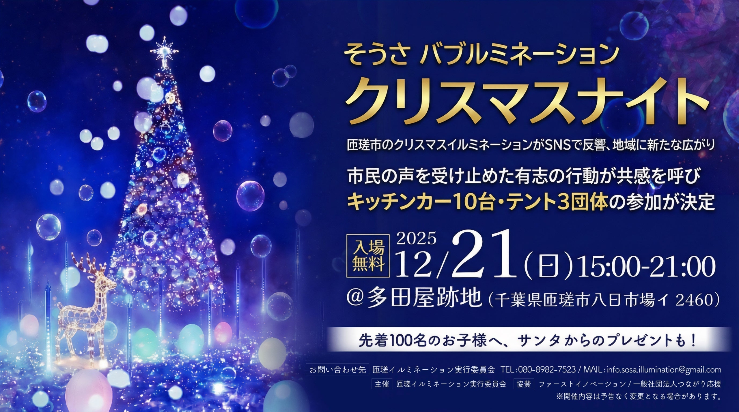 ファーストイノベーション(本社:東京都中央区晴海3-13-1 DEUX TOURS EASTタワー52F、代表取締役社長:木ノ根雄志)ならびに官民連携の地方創生団体『一般社団法人つながり応援』(理事長:清水国明、副理事長:木ノ根雄志・梶川隆史)は、2025年12月21日に千葉県匝瑳市で開催される地域イルミネーションイベント「そうさ バブルミネーション クリスマスナイト」に関する情報発信が、SNS上で大きな反響を呼んでいることをお知らせします。