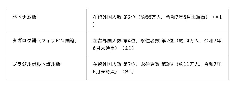 在留外国人の数は年々増加している中で、日本で医療機関を受診する外国人の出身国・地域や言語の多様化も進んでいます。現在展開中の3言語だけでは対応しきれない現状を受け、今回の3言語追加制作に至りました。