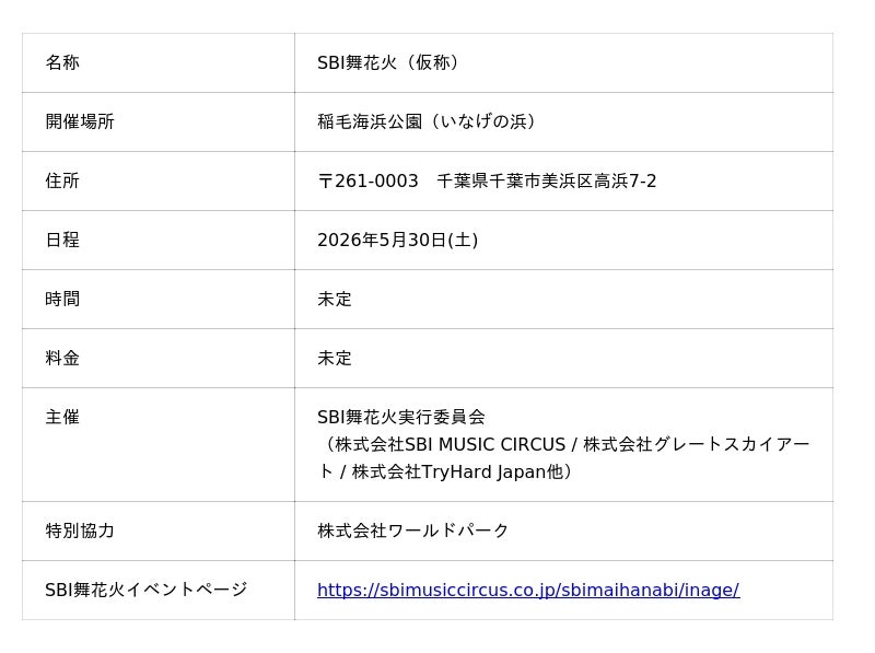 SBI舞花火実行員会及び、株式会社SBI MUSIC CIRCUS(本社:東京都港区、代表取締役社長:大付楽洋、以下「当社」)は、2026年5月30日(土)、千葉県の稲毛海浜公園にて「SBI舞花火(仮称)」を開催いたします。