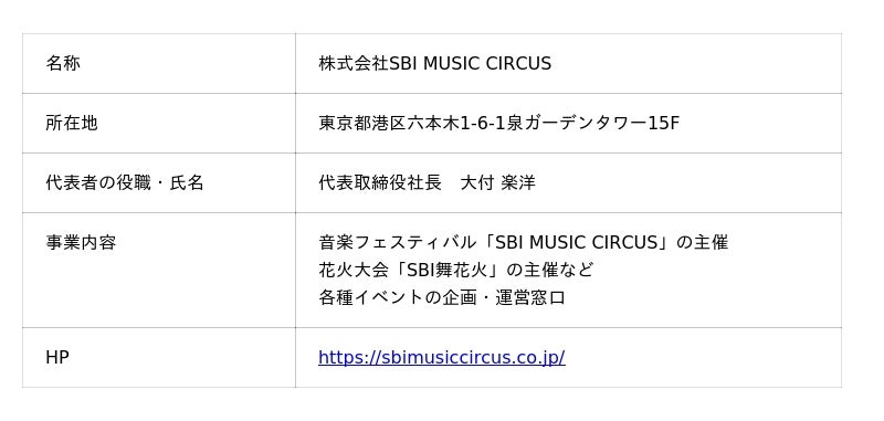 株式会社SBI MUSIC CIRCUS株式会社SBI MUSIC CIRCUSは、音楽の力と文化産業を融合させ、その地域と訪問者の双方に魅力的なコミュニティを提供します。