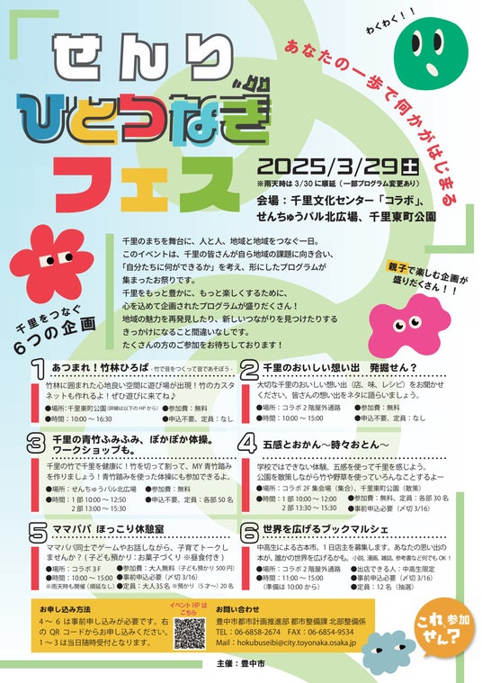 本市は、令和5年度(2023年度)に千里中央地区における課題とその解決策をまとめた「千里アクティビティガイド『これ、せん?』」を作成しました。今回、その作成に関わった市民や団体、企業とともに「千里をもっと楽しく、もっとつながるまちにすること」を目的に本イベントを企画しました。