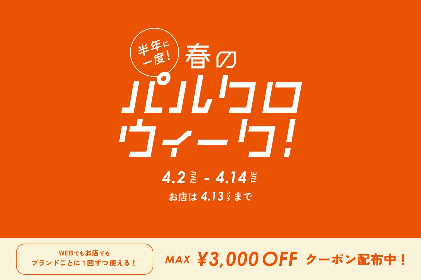 - 最大3,000円OFF!店舗とオンライン、それぞれで使えるクーポン配布 !期間中、パルグループの店舗とパルクローゼットでブランドごとに1回ずつ使える大変お得なクーポンをプレゼント!