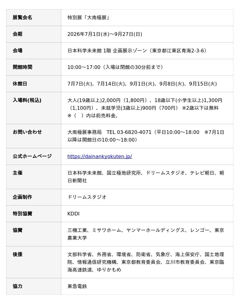 日本科学未来館(略称:未来館 館長:浅川智恵子)と、国立極地研究所、ドリームスタジオ、テレビ朝日、朝日新聞社が2026年7月1日(水)~9月27日(日)に開催する特別展「大南極展」について、展示詳細が決定しましたのでお知らせします。南極は人間活動による大気や環境への影響が少なく、現在の地球の状態をダイレクトに知ることができる場所です。日本が70年間にわたって南極で続けてきた観測は、気候変動の解明や未来予測に大きく貢献してきました。本展は、その成果を「見て学ぶ」だけでなく「体験しながら理解できる」展覧会です。