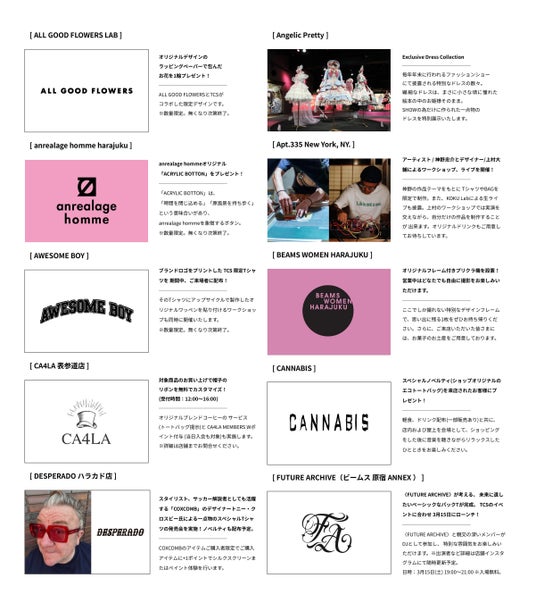 ALL GOOD FLOWERS LAB / Angelic Pretty / anrealage homme harajuku / Apt.335 New York, NY. / AWESOME BOY / BEAMS WOMEN HARAJUKU / CA4LA 表参道店 / CANNABIS / DESPERADO ハラカド店 / FUTURE ARCHIVE(ビームス 原宿 ANNEX )/ JOURNAL STANDARD 表参道 Mens / JOURNAL STANDARD 表参道 LADIES / KIOSQUE CC / Moore / SHEEP / STUDIOUS MENS 原宿本店 / STUDIOUS WOMENS 表参道 / THE FLWRS POP-UP at 701 supported by Tokyo Creative Salon / THREE TREASURES / ハウス@ミキリハッシン