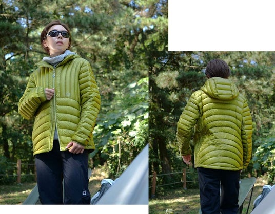 7Dの耐久撥水加工した独自の超軽量の表地(19g/sqm)に、少量でも優れた保温性を発揮するHUNGARIAN GOOSE DOWN FP800-850FPを110g(Lサイズ)充填しました。