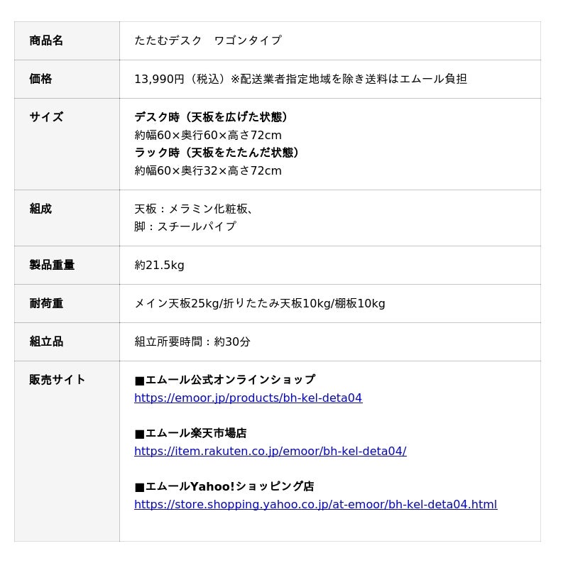 「身体に合った寝る・座る・たたむ」を提供する健康家具ブランドEMOORを展開する株式会社エムール(東京都立川市:代表取締役 高橋 幸司/以下、エムール)は、2026年4月3日より『たたむデスク ワゴンタイプ』の販売を開始しました。