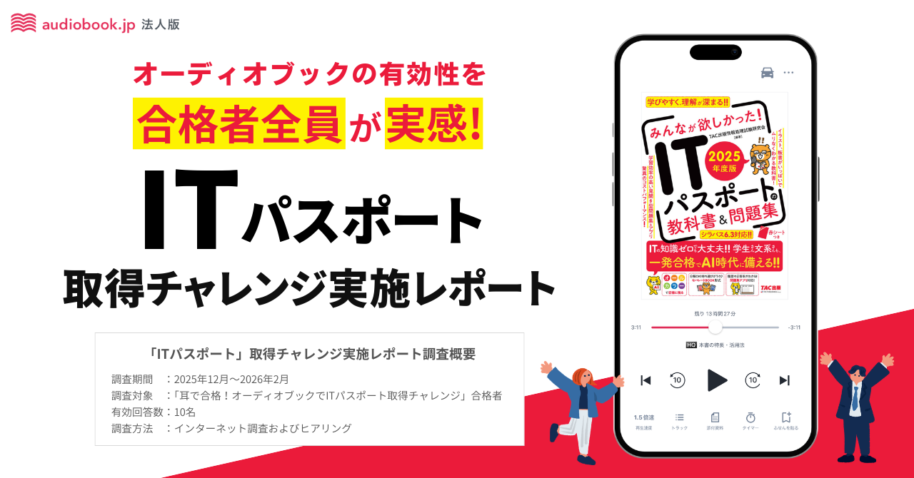 その実証として、『2025年度版 みんなが欲しかった! ITパスポートの教科書&問題集』(TAC出版)のオーディオブックおよびテキストを使い ITパスポート試験合格を目指す企画「耳で合格!オーディオブックでITパスポート取得チャレンジ」を実施。本企画には、audiobook.jpユーザー15名が参加し、11月~12月に受験を経て、10名が合格を果たしました。