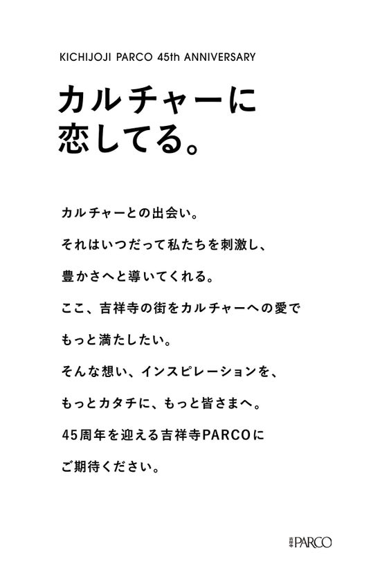 吉祥寺PARCOは1980年9月21日に開業し、2025年に45周年を迎えます。2025年はお客様への感謝と、文化に満ち溢れる吉祥寺の街をさらに盛り上げていきたいという思いを込めて、「カルチャーに恋してる。」をメッセージとして発信します。