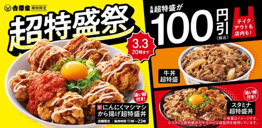 期間中、店内またはテイクアウトにて「牛丼超特盛」「豚丼超特盛」「牛カルビ丼超特盛」などの各種丼の超特盛サイズおよび「スタミナ超特盛丼」「にんにくマシマシから揚げ超特盛丼」を税込価格より100円引きで提供します。「超特盛祭」に合わせて全国のから揚げ販売店舗で販売を開始する「にんにくマシマシから揚げ超特盛丼」は、特製から揚げを豪快に盛り付けた、食欲をそそる一品です。