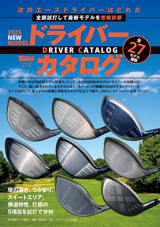 綴じ込み付録は2025NEWドライバーカタログ。最新の8メーカー、27機種を全て試打して、そのモデルの性格診断を掲載。次のエースドライバー選びに役立つ!