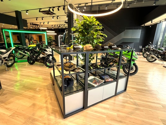 国道41号線沿いショッピングセンターにある「カワサキ プラザ小牧」がリニューアル!ウッディな明るい店内に生まれ変わった大型ショールームに話題の車両を数多く展示しています。
