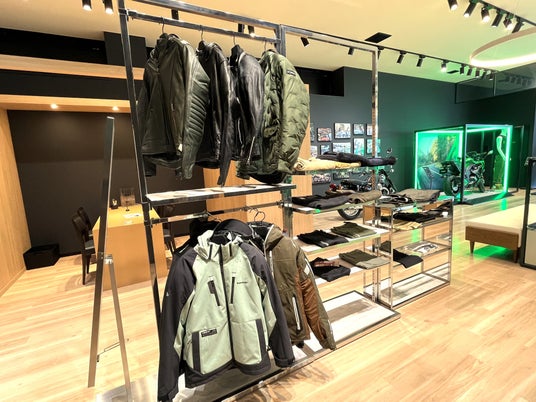 木目調のフロアと白い天井が織りなす明るい店内。モーターサイクルとプラザアパレルがゆったりと展示され、どなたでも楽しめる空間となっています。