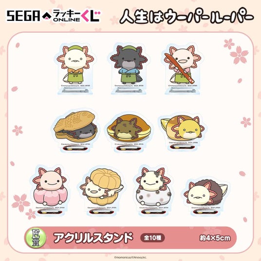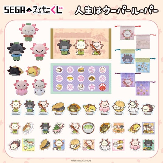株式会社セガ フェイブは、セガ ラッキーくじオンライン「人生はウーパールーパー -和菓子屋さん開店!-」を2025年4月10日11時より販売開始いたします。  セガ ラッキーくじオンライン「人生はウーパールーパー -和菓子屋さん開店!-」は、和菓子屋さんをコンセプトにセガ限定で描き下ろしたイラストを使用したオンラインくじです。  はっぴ衣装や和菓子すがたがかわいい賞品をご用意。A賞「バスタオル」やB賞「ぬいぐるみ」、C賞「巾着」など、実用的で嬉しいアイテムを多数ラインナップいたしました。  クレジット決済以外にもキャリア決済やAmazon Payや楽天ペイなど様々な決済方法もご用意しています。Amazonギフトカード等でもくじを引く事が出来ますのでくじ初心者の方でも安心してお楽しみいただけます。  ここでしか手に入らない「人生はウーパールーパー」のアイテムを、ぜひお手元にお迎えください。  <賞品イメージ>