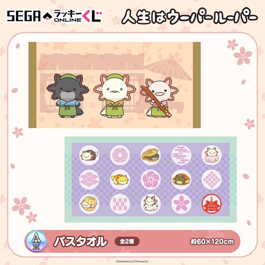 株式会社セガ フェイブは、セガ ラッキーくじオンライン「人生はウーパールーパー -和菓子屋さん開店!-」を2025年4月10日11時より販売開始いたします。  セガ ラッキーくじオンライン「人生はウーパールーパー -和菓子屋さん開店!-」は、和菓子屋さんをコンセプトにセガ限定で描き下ろしたイラストを使用したオンラインくじです。  はっぴ衣装や和菓子すがたがかわいい賞品をご用意。A賞「バスタオル」やB賞「ぬいぐるみ」、C賞「巾着」など、実用的で嬉しいアイテムを多数ラインナップいたしました。  クレジット決済以外にもキャリア決済やAmazon Payや楽天ペイなど様々な決済方法もご用意しています。Amazonギフトカード等でもくじを引く事が出来ますのでくじ初心者の方でも安心してお楽しみいただけます。  ここでしか手に入らない「人生はウーパールーパー」のアイテムを、ぜひお手元にお迎えください。  <賞品イメージ>   ▲A賞:バスタオル