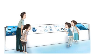 横幅30メートルの大迫力のシアターや、現役の商船三井グループの船舶模型の展示などを通して、私たちの生活を支える海運について、楽しく学ぶことができます。来館者の方が描いた船の絵が壁面を動く、インタラクティブアートも展示予定です。