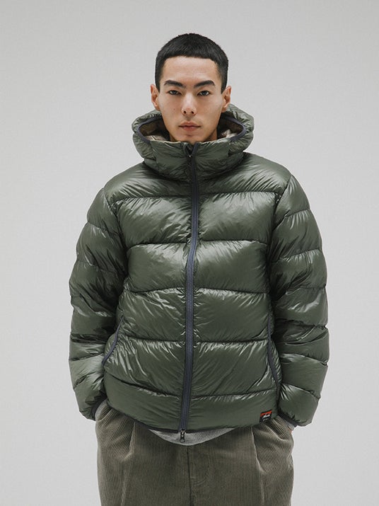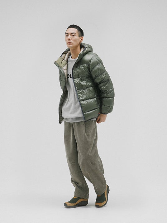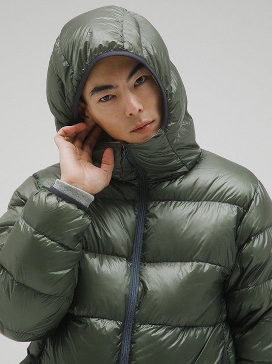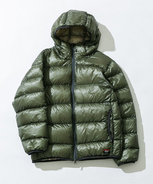 表地・裏地ともに10デニールナイロン(ミニリップストップ組織)を使用し、10Dナイロンの軽量さ、ダウンの暖かさとソフトな着用感をダイレクトに感じられる削ぎ落としたデザインが特徴です。