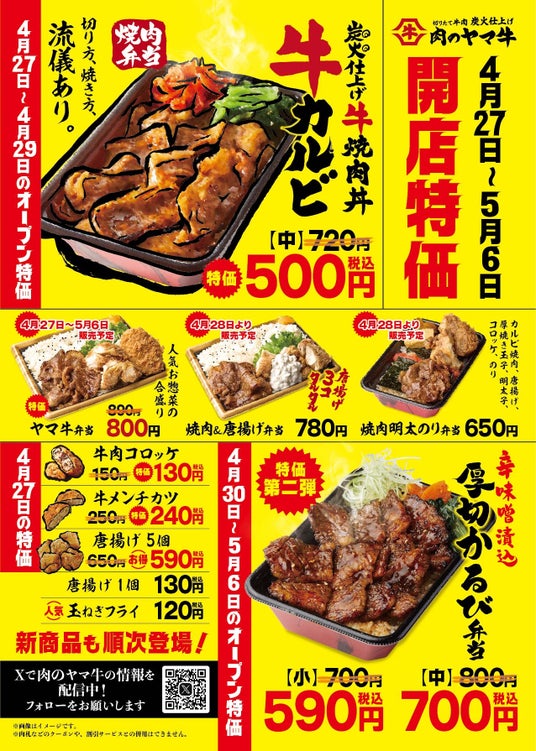 グランドオープンを記念し、4月27日(日)~4月29日(火)までの3日間限定で肉のヤマ牛の看板商品である炭火仕上げ『牛カルビ焼肉丼(中)』を720円→特別価格500円で販売いたします。また続く第2弾として、『辛味噌漬込厚切かるび弁当(中)』は800円→特別価格700円で販売する等、多くの看板商品をお楽しみいただけるようにご準備をしております。