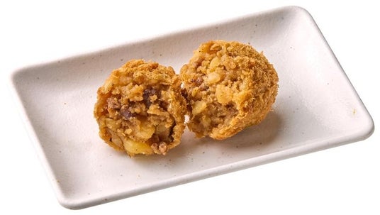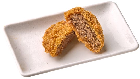 【牛メンチカツ】肉の旨みをしっかり感じていただきながらも玉ねぎの甘さも感じていただける仕立てに。そのまま食べるのもおすすめです。