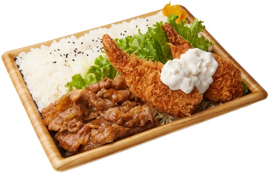 【焼肉エビフライ弁当】炭火仕上げの香ばしい焼肉もエビフライも両方食べたい!の声にお応えしたお弁当です。ヤマ牛のエビフライは1つに海老が2尾入ってプリップリ感が最高。贅沢なお弁当です。 【肉のヤマ牛 おすすめ惣菜】