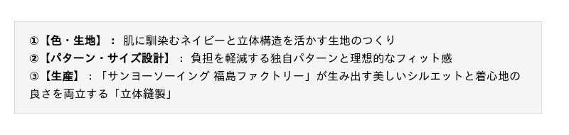 また、衣料品の国内生産比率が低下する中、日本製の良質な衣料品を継続的に届けることは、国内に自社工場を持つ当社の重要な役割であり、本商品もそうした取り組みの一つとして開発しています。