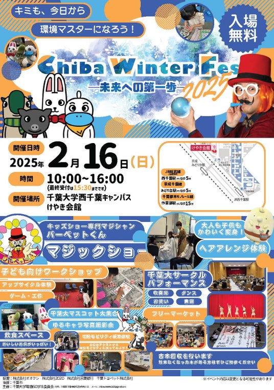 学生委員会の発案で2017年度に始まった「Chiba Winter Fes」は、地元企業10社以上と近隣飲食店等の協力をいただいて開催される、環境やSDGsに関する啓発イベントです。子どもから大人まで楽しみながら環境について学ぶことができる冬のイベントとして定着しつつあります。